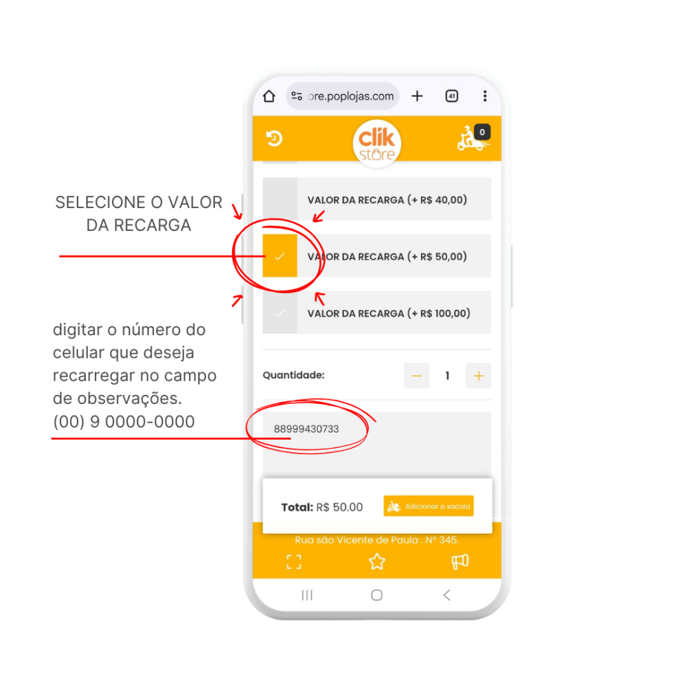 Escolha o valor da recarga e insira o número do seu telefone no campo de observação.